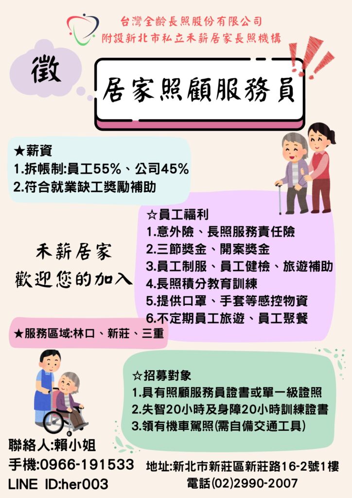 人才招募 是一份工作,也是一份責任和使命,更是對長者生活品質的關懷和提升,敬邀您和我們一起共創實踐。 在全齡禾薪,我們不僅僅是一家居家式長照機構,更是一個充滿理想的大家庭,致力為長輩提供最溫暖、最專業的照顧服務,讓他們感受到無微不至的關懷和呵護。我們相信,每一位長輩都值得被尊重、被呵護,而這正是我們存在的意義。如果您願意和我們一起,為了這份理想和使命,為了讓更多的長者擁有尊嚴和幸福的晚年生活,我們誠摯地歡迎您的加入,讓我們攜手共創美好,以人為本,以愛為根。 誠徵居家照顧服務員 【薪資】1.拆帳制:BG碼全拆,員工55%,轉換平均時薪約為284元/時。2.我們為勞動部「照顧服務員就獎勵」之適用單位,符合獎勵條件之照顧員,獎勵金額最高可領10萬8千元。【多元福利】1.提供特休金、婚喪禮金、生育禮金、佳節禮金、年終獎金及尾牙或春酒。2.辦理員工聚餐及員工旅遊,促進員工間的工作情感交流。3防疫感控,提供口罩、手套等感控物資,確保服務安全。4.每年度安排員工進行身體健康檢查,重視自我健康守護。5.任職工作期間,提供員工制服,提升工作服務專業形象。6.提供開案服務獎金,增加服務團隊量能。【就業優勢】1.服務區域林口、新莊、三重區我們服務安排以小區域為主,避免車程奔波,若有承接跨區服務,另提供跨區交通補助津貼。2.就業保障我們對於單位工作人員,在勞工保險皆依實質薪資報酬進行納保,另外投保意外險(包含非工作時間)及照顧服務責任險等福利保險,重視工作人員的保障及降低責任風險。3.職前訓練新進人員到職時,我們將安排讓您認識整體工作環境、服務工作內容規範及實際跟訪實習服務現場,了解並融入工作團隊。4.在職訓練任職期間,每年提供至少20小時免費長照積分課程補助,除提升服務工作的知能外,也安排相關抒壓活動,調適身心壓力。5.團隊工作工作服務前,督導會共同訪視,實際了解服務環境及確認服務安排,降低工作中的服務風險。6.服務支持遇到服務工作狀況時,督導共同討論,適時提供資源介入,或專業人員到服務現場指導,給予輔具使用,降低職業災害。【招募對象】1.具有照顧服務員結訓證書或單一級證照,另完成20小時失智症課程及身心障礙課程訓練佳。2.具有機車駕駛能力及駕照,需自備交通工具。 誠徵居家服務督導員 【工作內容】1.接案、評估個案需求及擬定照顧服務計畫。2.追蹤了解照顧服務人員執行照顧計畫。3.個案與服務合作單位溝通協調。4.服務個案檔案之保管與維護。5.執行個案工作相關行政文書表單。【條件要求】1.具有居家督導員職前訓練結業證明書。2.具有機車駕駛能力及駕照,需自備交通工具。【福利待遇】1.月薪33,000-39,000/月,視過往相關資歷及居督證執照進行加給。2.提供特休、婚喪禮金、生育禮金、佳節禮金、年終獎金及尾牙或春酒。3.辦理員工聚餐及員工旅遊,促進員工間的工作情感交流。4.我們對於單位工作人員,在勞工保險皆依實質薪資報酬進行納保,另外投保意外險(包含非工作時間)福利保險,重視工作人員的保障。 聯繫資訊-許小姐新北市新莊區新莊路16-2號1樓 02-2990-2007 Line ID:0972-107240